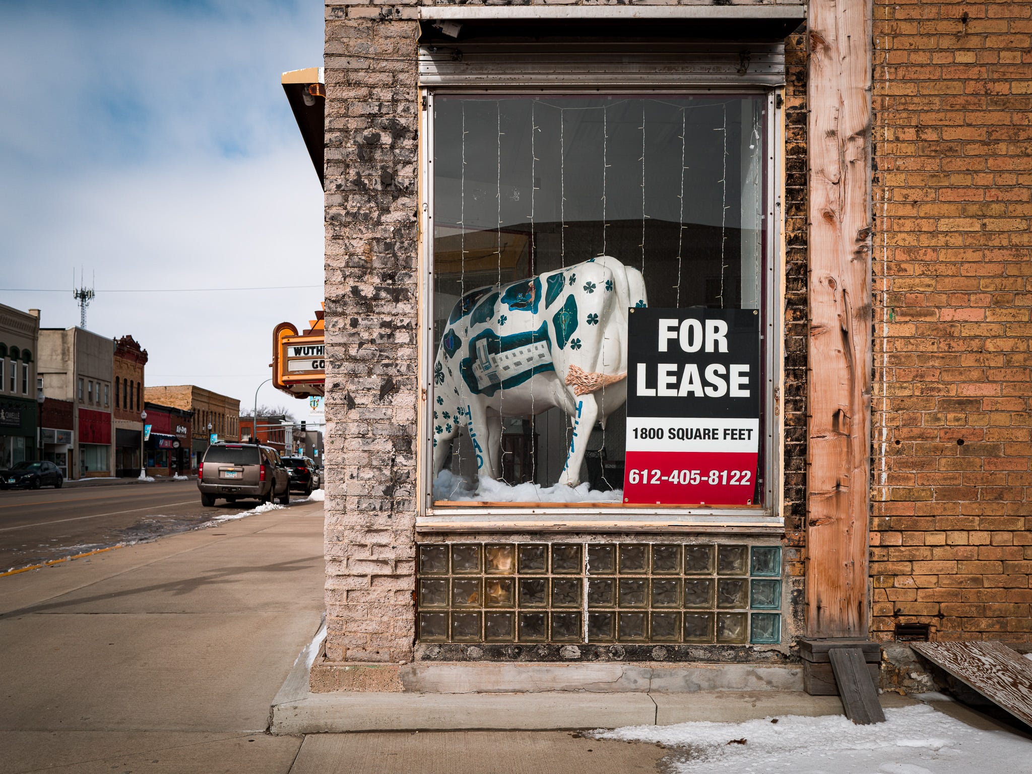 Now the windows hold different stories. A red door with hearts taped inside the glass, trying to summon romance back into the room. A storefront for lease, the square footage listed with quiet hope. A decorative cow in a dusty display window, painted with symbols of a town that once fed itself.